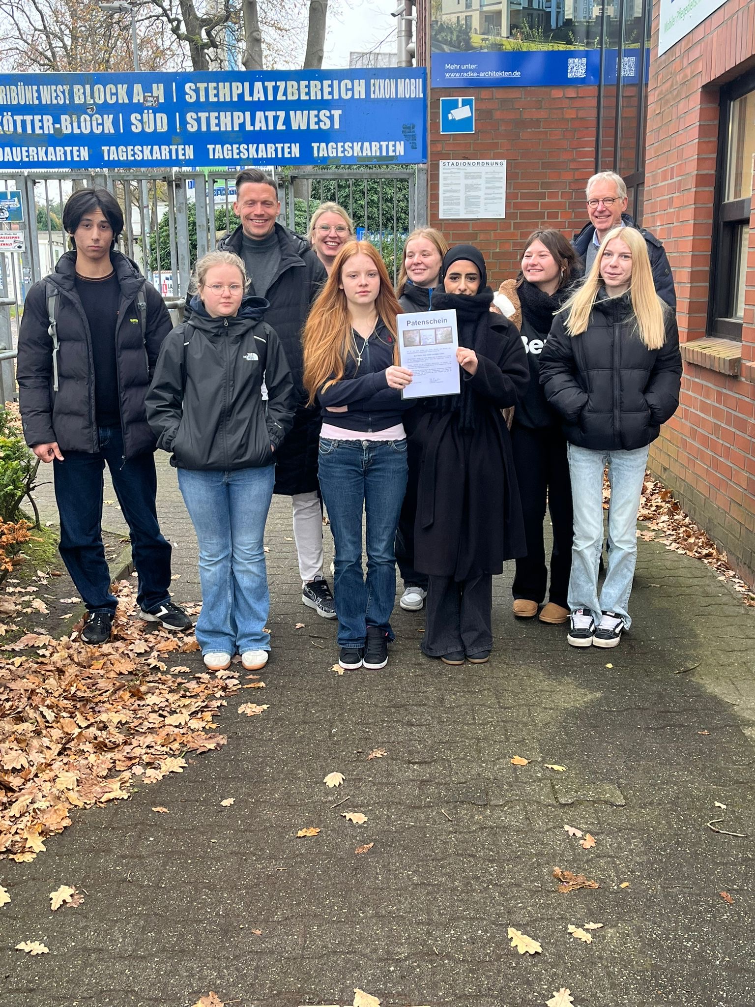 Zum Auftakt gab es eine kurze Info-Runde zu den Hintergründen der Stolpersteine und ihrer Verlegung an der Hänsch-Arena. Anschließend ging es gemeinsam zu den Stolpersteinen, wo Herr Berentzen den Schülerinnen und Schülern feierlich die Urkunde überreichte, die die Patenschaft offiziell bestätigt.